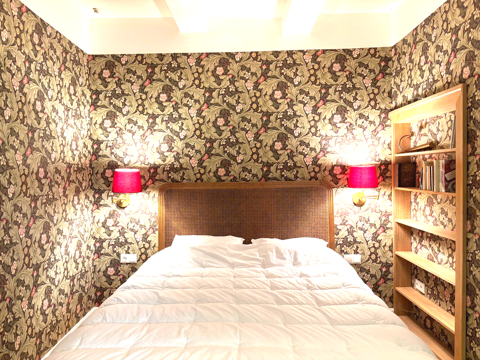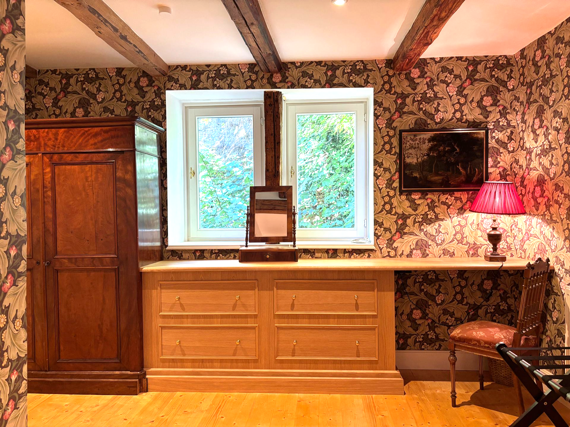 Eine breite Barocktreppe führt zur Wohnung im 1. Stock vom Gästehaus. Die 80Qm große Wohnung ist frisch saniert. Ihre alten Holzfußböden, das sichtbare Fachwerk, die englischen Wandtapeten und diverse Tischlerarbeiten, strahlen eine sehr gemütliche Athmosphäre zum Wohnen aus,